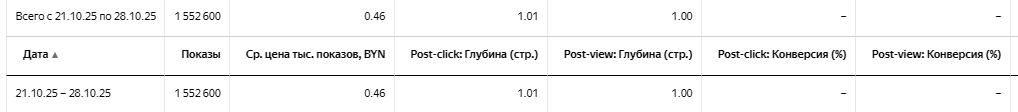 - Post-click и Post-view конверсии — целевые действия, совершённые после клика по баннеру или просто после его просмотра. Анализ этих данных помогает оценить реальное влияние рекламы на поведение пользователей.