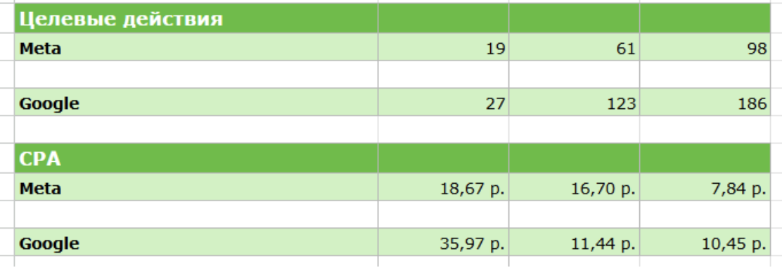 Рост целевых действий в Google на 51% и в Meta на 60% при том же бюджете.